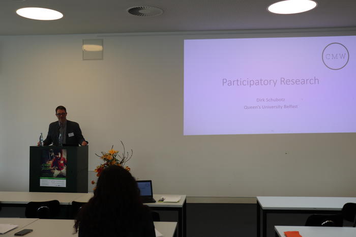 - Dr. Dirk Schubotz (Queen´s University Belfast) addressed in his keynote the possibilities of participatory research. He discussed the background of participatory research in critical and feminist approaches. Criticizing “feel-good-research” he demanded to ask for “real change” for marginalized people in participatory research projects.