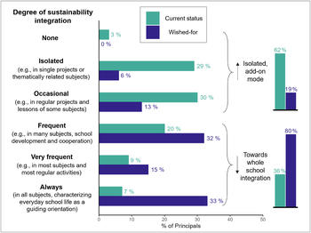 Mit Blick auf die Diskrepanz zwischen dem Wunsch von Schulleitungen, Lehrkräften und Schüler:innen einerseits und der Realität andererseits, werden in der Studie Entwicklungspfade für Nachhaltigkeit und BNE im Schulsystem abgeleitet. Da Klimakrise, soziale Ungleichheit und andere Nachhaltigkeitsprobleme hochgradig struktureller und systemischer Art sind, wird in der Studie die Bedeutung von kollektivem und strukturorientiertem Handeln sowie der Stärkung demokratischer Partizipationsfähigkeit hervorgehoben. Dieses könne in Schulen erlebt und gelernt werden, wenn im Sinne des Whole School Approachs demokratische Lernräume und Kontexte für das Erfahren und Experimentieren mit Nachhaltigkeit entwickelt werden. Dabei sei für eine kohärente Nachhaltigkeitsbildung auf Ebene des Schulsystems wichtig, Nachhaltigkeit mit den Handlungsfeldern der Schulqualitätsentwicklung zu verbinden und mit entsprechenden Mitteln zu untersetzen. Nachhaltigkeit auf diese Weise zu einem Standard werden zu lassen sei, so das Autorenteam des Institut Futur, eine auch von den Schulleitungen gewünschte Kernaufgabe hochwertiger Bildung im 21. Jahrhundert.
